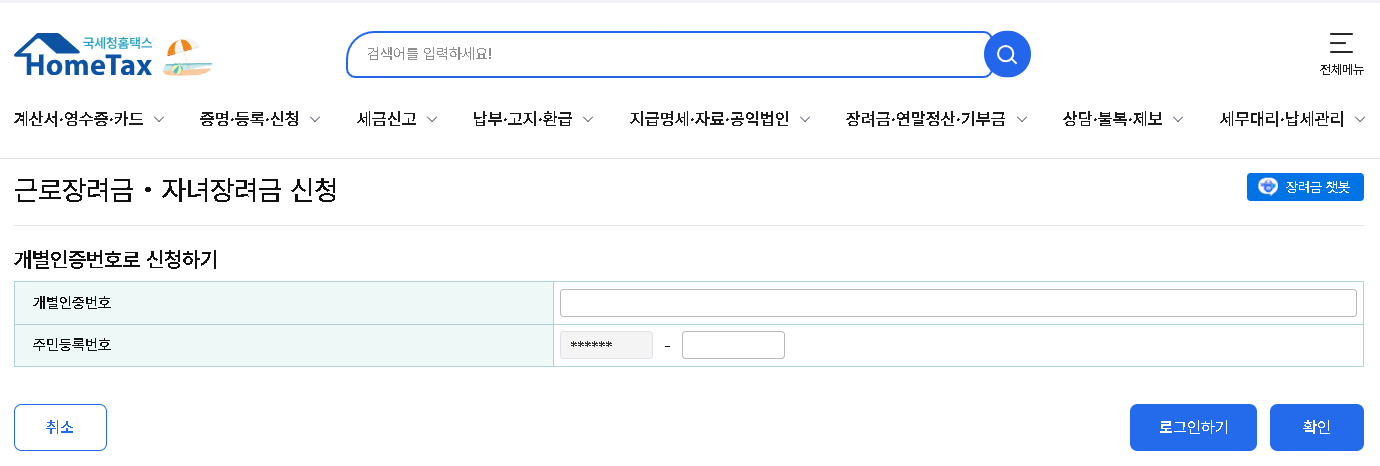 - 로그인 → ‘근로·자녀장려금 신청’ 메뉴 이용
