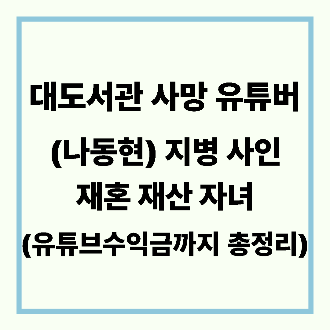 대도서관 사망 유튜버(나동현) 지병 사인 재혼 재산 자녀(유튜브수익금까지 총정리)패션 뷰티 건강 다이어트/생활꿀팁 일상 소식 2025. 9. 6. 20:07반응형
