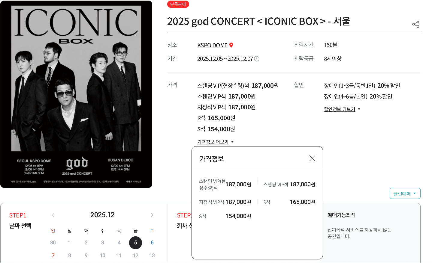 좌석 등급 가격 VIP석 약 187,000원 R석 약 165,000원 S석 약 154,000원 좌석 구역, 스탠딩 여부, 시야 제한 등에 따라 가격 차이가 있을 수 있으니 예매 페이지에서 반드시 확인하시기 바랍니다.